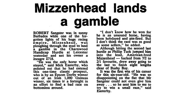 In 1979 Robert Sangster sent me a crock of a horse called Mizzenhead.