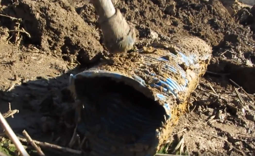 He finds a broken section of blue pipe that's been taken out of the trench and prods it with his stick.