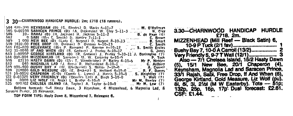 Mizzenhead made his debut over hurdles at Stockton in January 1980 where he gave a suggestion of ability by finishing 6th of 16 runners but he didn't see the two miles out properly. I decided to drop him back in trip on the flat and found a little race, again at Stockton, where he came in fifth. A few weeks later he showed a great deal of improvement and finished runner up at Hamilton Park under my marvellous stable jockey Terry Lucas. He was second favourite that day but was outpointed by a 28/1 outsider trained by Gordon Richards.