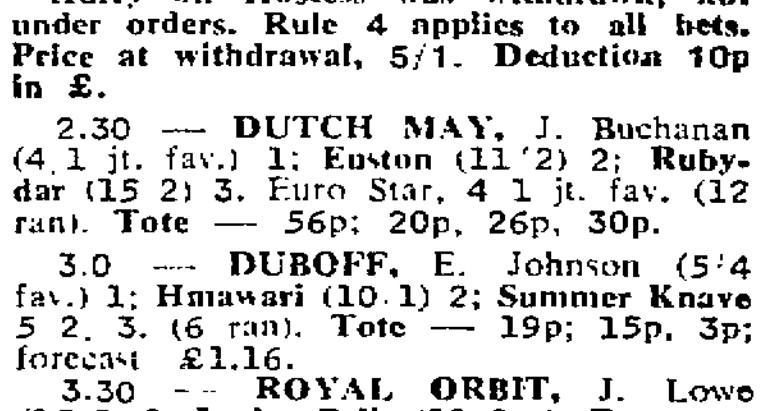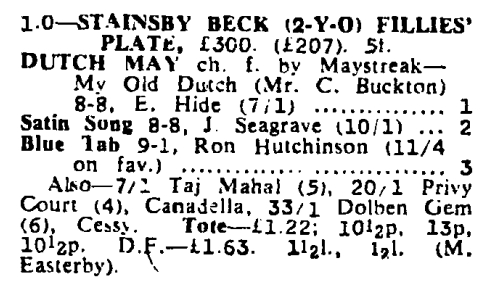 Dutch May was a seven-times winning sprinter and a half-sister to Dutch Gold. She won as a juvenile at Teesside and as a three-year-old she won six races with four victories at Ripon and also at Ayr and Haydock. Dutch May was retired to the paddocks and became the dam of multiple winner Lucky Dutch.